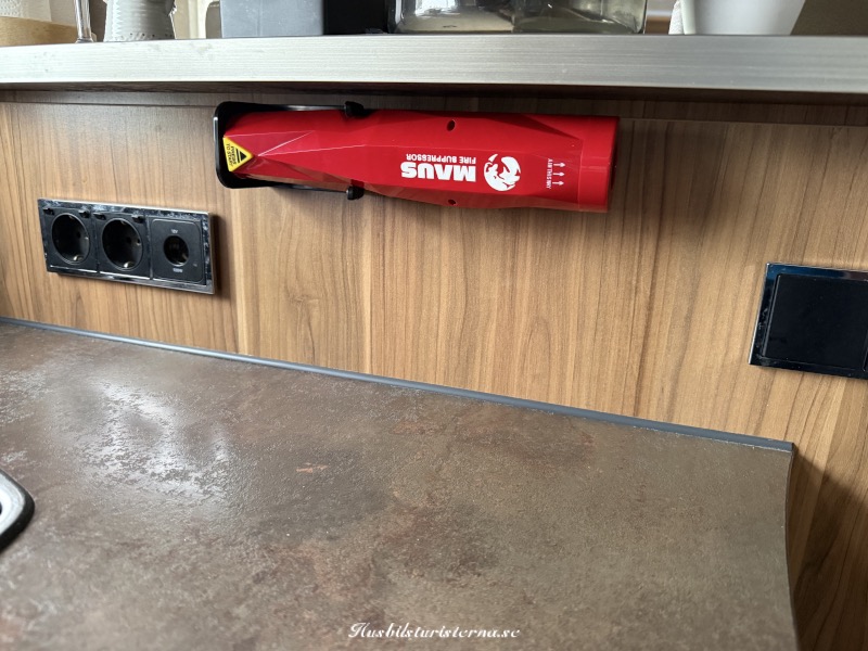 Vi hade varit på en husbilsmässa på Tumbo för några veckor sedan och köpt en MAUS Xtin Klein brandsläckare. Nu var det dags att skruva fast den på lämpligt ställe.