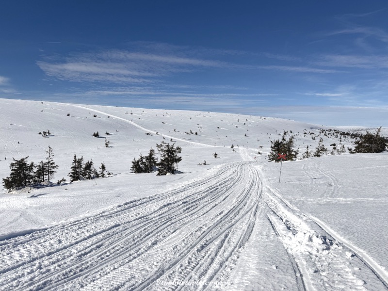 Fortsatte skoterturen ner mot fjällcaféet, som ligger till vänster utanför bild. Man ser skoterleden fortsätta upp på fjället (upp till vänster i bilden).