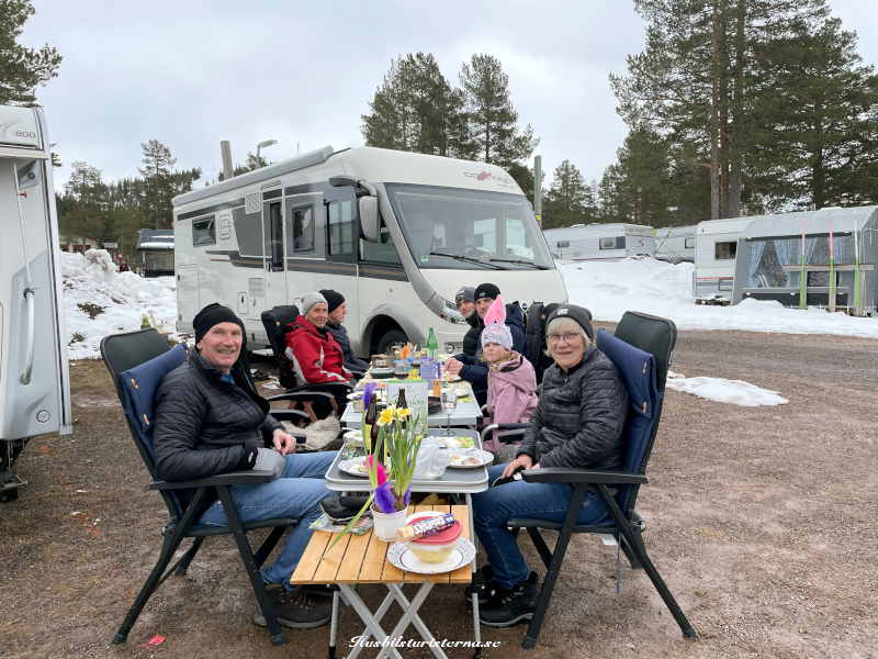 Blev några timmars utförsåkning nästa dag, och efter lunch började vi plocka ner förtältet. Man ser på snögubben framför husbilen att det töat rejält.