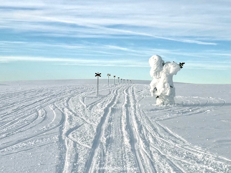 Åkte sen en bit bort mot Stöten. Uppe på fjället stod ett snötäckt träd som såg lite ut som ett mumintroll som pekade åt höger.