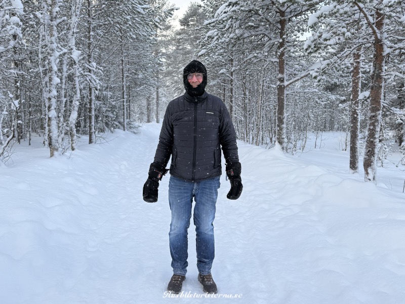 Dagen efter gick vi på promenad för att Einar skulle få testa födelsedagspresenterna, som han fått i förväg. De röda fläckarna vid handlederna är kontrollampor för de elupvärmda handskarna. Att Einar dessutom har på sig elupvärmda långstrumpor syns inte, men det kändes varken i händer eller fötter att det var 14 minusgrader ute.