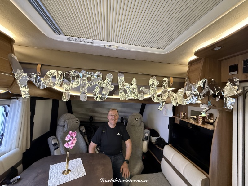 Bettan hade smugit upp en banderoll i husbilen, medan Einar sov.