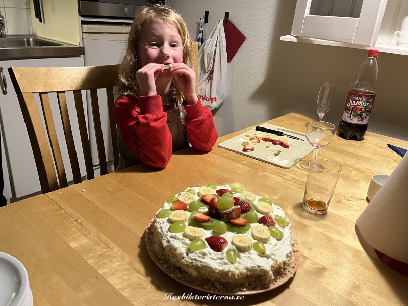 På kvällen åt vi taco-buffet hos Anette och Hasse. Efter maten gjorde Bettan en tårta, som Wilma fick garnera med frukt. Då det var klart åt hon upp frukten som blev över.