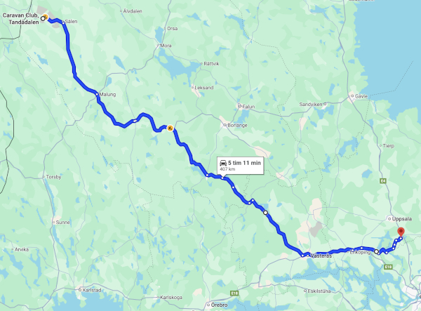 Fortsatta resan till campingen gick ungefär som vanligt, bortsett från trafikljusreglerad väg sista kilometrarna. Man hade också satt upp förbud mot vänstersväng in på campingen, så vi fick åka ett varv i en rondell för att komma från rätt håll.